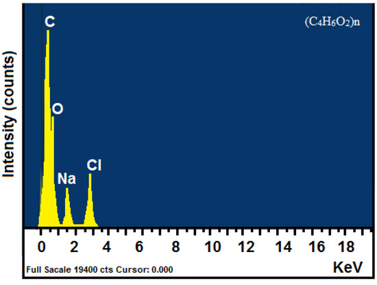 To investigate the chemical composition of the formed biopolymer, an EDS analysis was conducted on PHB synthesized by C. necator (see Figure 8). This analysis shows carbon and oxygen to be principal components, with 50.74 wt% and 38.77 wt%, respectively [53,54]. The results indicate a very low level of impurities, which correspond to the sodium and chlorine traces from the PHB extraction method employed in the current research (Table 4). Other studies reported residual elements such as sodium hypochlorite, an essential component during the extraction process [54,55]. To remove these types of impurities, PHB can undergo an effective purification process that enables its safe commercial application.