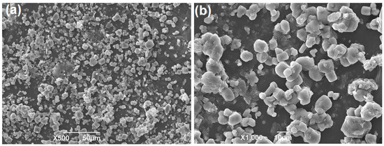 The SEM micrograph analysis obtained for the PHB shows a distribution of micro- and nano-pellets with a spindle-shaped morphology (Figure 9a). In Figure 9b, the magnification of the obtained pellets is analyzed, showing an irregular surface with a varied morphological distribution from angular rounded geometries with flake shapes [53]. A similar semi-crystalline morphology with a brittle appearance characteristic of PHB was also reported by [55]. The morphological nature analyzed by SEM allows us to identify—from the morphology of the PBH pellets—that they are optimal for subsequent extrusion or 3D printing processes.