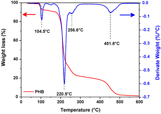 The thermal stability of PHB was analyzed by TGA, as shown in Figure 10. It can be seen from the TGA curve that PHB exhibited the first one-step thermal degradation with an onset at 85.6 °C and a minimum centered at 104.5 °C, while the second and most important process in the one-step thermal degradation was onset at 173.2 °C and its minimum was centered at 220.5 °C. Finally, the third change in the thermogram begins one-step thermal degradation with an onset at 407.5 °C and its minimum was centered at 468.7 °C. Additionally, Figure 10 depicts the TGA and the derivate weight profiles of PHB produced by C. necator using dextrose from cassava starch as a carbon source. The TGA curve shows the weight loss of the synthesized PHB in three stages. The first or initial stage of mass loss occurred in the temperature range of 85.6 °C to 173.2 °C. This mass loss can be associated with the loss of ambient humidity acquired by the hydrophilic characteristics of the PHB polymer. Moreover, this mass loss was approximately 1.0% of the total mass, which occurs due to the evaporation of physically adsorbed solvents such as sodium hypochlorite and chloroform on the polymer. Furthermore, the second and most relevant step in the degradation of the PHB was observed in the temperature range of 173.2 °C to 220.5 °C and can be related to a reduction in molecular weight, which includes chain scission and hydrolysis. The faster thermal degradation of PHB that occurs in this stage is obtained via the destruction of H-C-H from CH3 groups, C=O ester carbonyl group, and alkyl (CH3) halides, such as was observed in the FTIR results (Figure 7), and the destruction of crystalline regions associated with orthorhombic unit cells, such as was observed in the XRD results (Figure 6). The third step of weight loss was observed in the temperature range of 407.5 °C to 468.7 °C and occurs with a further rise in temperature, as hydrolysis also contributes to degradation, along with chain scission, with the subsequent formation of crotonic acid. Finally, it can be observed that the maximum degradation temperature for PHB obtained by C. necator is 451.8 °C. Comparing our results with other reports in the literature, a decomposition temperature 49 and 33% higher than the PHB obtained in other studies can be observed [56,57]. Therefore, the degradation temperature for the current polymer showed high thermal stability compared with other biopolymers [47]; this will allow it to be used in applications where high temperatures are required.