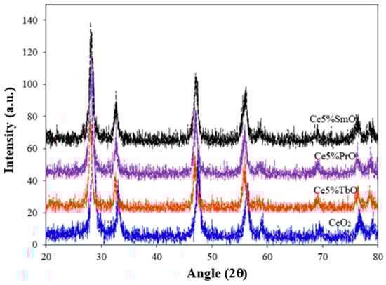 The XRD patterns of CeO2 and doped ceria are presented in Figure 1. Ceria appears to be phase-pure with the cubic crystal structure. The diffraction peaks of all samples correspond to the cubic ceria fluorite type. The absence of other oxide reflections in M-doped ceria (M = Sm, Tb and Pr) indicates that these metals incorporate into the subsurface region of CeO2 lattice to form a solid solution. The lattice parameter (Table 1) is calculated from an X-ray line broadening at ~28°. The result reveals that the lattice constant of CeO2 (0.5412 nm) is smaller than that of doped CeO2. The diffraction peaks of M-doped ceria (M = Sm, Tb and Pr) are slightly shifted to lower angles due to the substitution of Ce4+ by larger cations. The shift effect to lower angles suggests unit cell enlargement. The increase in lattice parameters indicates that Ce4+ ions are replaced by larger cations. Comparison of ionic radii of Ce4+ (0.097 nm), Sm2+ (0.111 nm) and Sm3+ (0.108 nm) indicated that the dopant ions exhibited in the CeO2 lattice should be either Sm2+ or Sm3+ or a combination of both. The oxidation state of Sm can be investigated using another advanced analytical technique such as XAS. However, samarium oxidation state should be Sm3+ under calcination temperature. It should be mentioned that Sm ions incorporation in CeO2 lattice generates a strain and unbalanced charges, thereby, oxygen vacancies are produced.