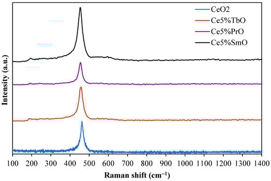 Raman spectra of CeO2 and Ce–M–O mixed oxides (M = Sm, Tb and Pr) are presented in Figure 3. The Raman spectrum of ceria appears as a single sharp band at 462 cm−1 which is assigned to the Raman active triply degenerate F2g mode [15]. A fluorite structure of ceria exhibits symmetrical stretching vibrations of oxygen atoms surrounding the cerium cation. In Ce–M–O (M = Sm, Tb and Pr) mixed oxide materials, F2g mode shifts to lower energies due to the incorporation of large cations in the CeO2 lattice. In addition, the Raman bands at ~550 cm−1 can be seen with the addition of Sm, Tb or Pr to CeO2. This mode is ascribed to the extrinsic oxygen vacancies induced by the replacement of Ce4+ ions with Mn+ ions (M = Sm, Tb and Pr) in order to maintain charge neutrality [16]. Furthermore, the intensity of this mode increases when Sm is added into CeO2. Therefore, the incorporation of Sm into CeO2 lattice leads to an increase in oxygen vacancies and Ce3+ sites.