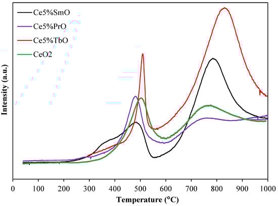 Figure 4. H2–TPR profiles of CeO2-based materials.