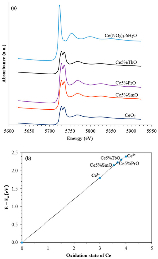The electron movement within CeO2-based materials was studied using the X-ray absorption near edge structure (XANES) technique to explain the role of Sm, Tb and Pr in increasing the water–gas shift activity of ceria. XANES spectra and the edge energy shift of Ce5%SmO, Ce5%TbO, Ce5%PrO, Ce(NO3)3.6H2O and CeO2 relative to the Ce0 edge energy are presented in Figure 5. XANES spectra of standard Ce(NO3)3.6H2O (Figure 5a) presents a single white line at 5725.4 eV. The edge energy is the energy required to raise electrons up from their core level to the unoccupied valence band. The edge energy of standard Ce0, Ce3+ and Ce4+ is plotted against its oxidation states (Figure 5b). The edge energy shifts of Ce5%SmO, Ce5%TbO, Ce5%PrO relative to standard Ce0 are placed on this straight line. The Ce oxidation states in these samples lay between +3 and +4. Moreover, the Ce oxidation state in Ce5%SmO compound is the lowest. The results suggest that Sm reduced CeO2 easily by transporting its electron into d-orbitals of Ce and giving rise to more Ce3+ at the CeO2 surface.