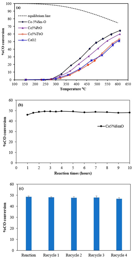 Figure 6. Effect of reaction temperature (a) and reaction time (b) on %CO conversion of CeO2-based materials and stability test by recycling the catalyst in five consecutive batch mode reactions over Ce5%SmO catalyst (c).