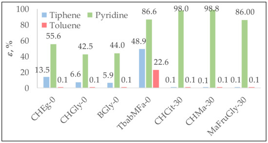 Extraction efficiency of pyridine, thiophene, and toluene for different DESs (shaker, 24 h and 25 °C).