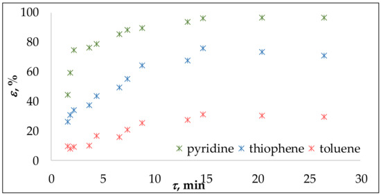 The retention time in the continuous extraction process was varied by modifying the flow rates of solvents and by changing millireactor lengths (Table 5). Figure 4 shows the extraction efficiency of pyridine, thiophene, and toluene as a function of retention time in a defined slug flow regime. Extending the retention time from 1.6 to 26.5 min improved the extraction efficiency. Shorter retention times led to lower extraction efficiency, as the retention time became insufficient for achieving stationary conditions. Equilibrium was attained after 14 min for all extracted components. This retention time was achieved in a reactor with a length of 50 cm and at a volumetric flow rate of 100 μL/min for the FCC gasoline and 66 μL/min for TbabFa-0 (S = 1). Since the used apparatus could not achieve lower flow rates, extending the millireactor’s length is a more effective way to increase the retention time. Specifically, Figure 4 demonstrates a trend in increasing of the extraction process efficiency for all three components, irrespective of the way used to achieve the retention time.