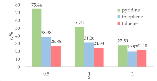 Also, even though they had a high viscosity, DESs made without water and DESs that were less acidic and polar worked better for extracting thiophene (Table 7 and Figure 2). The presence of water in DESs has a negative effect on the extraction of thiophene, while on the other hand, the addition of water has no effect on the extraction of pyridine from the model fuel [4]. Also, HBAs have a strong influence on the extraction of thiophene from the model fuel, i.e., for this specific purification process, tetrabutilammonium bromide is more favored as HBA than choline chloride or betaine. The formation of hydrogen bonds between the extracted component and the DES is the main driving force for the extractive desulfurization, as pointed out by Li et al. [28].