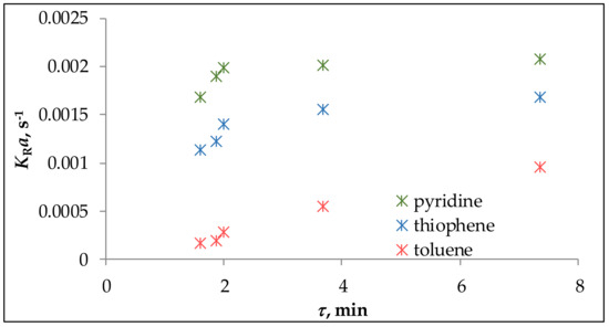 Figure 6 shows the volumetric mass transfer coefficients, Kr·a, for the raffinate phase in extraction with TbabFa-0 at a DES-to-feed mass ratio of one. As the retention time increases, the volumetric mass transfer coefficients for all key components increase until they reach a stationary condition. The removal of pyridine yielded the highest volumetric mass transfer coefficients, whereas toluene yielded the lowest volumetric mass transfer coefficients, which is in coincidence with extraction efficiency results. The volumetric mass transfer coefficient reflects both the efficiency of mass transfer (through the mass transfer coefficient) and the extent of the interfacial area available for that transfer. In this case, the mass transfer coefficient is the primary factor determining the value of the volumetric mass transfer coefficient, as surface tension forces outweigh inertial forces at low flow rates, resulting in a stable slug flow regime and a constant interfacial area. As the efficiency of extraction and subsequent mass transfer increases with retention time (Figure 6), the volumetric mass transfer coefficient increases.