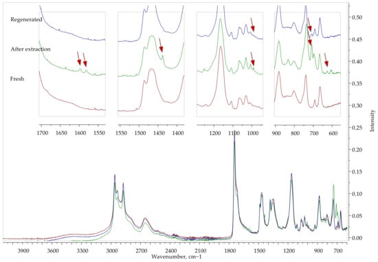 The comparison of FTIR spectra of fresh, after-extraction, and regenerated TbabFa-0. The red arrows indicate the peaks of the remaining components after extraction and purification.