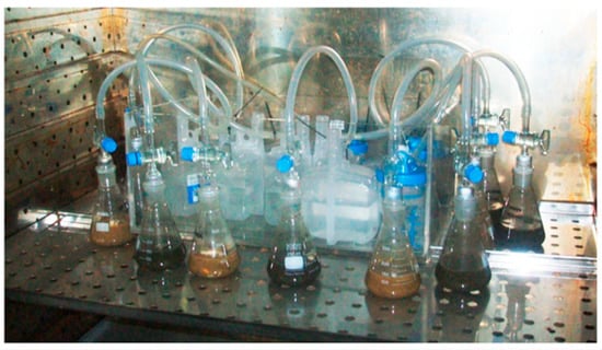 The reactors were provided in a suitable arrangement to prevent the entry of oxygen and to allow for the observation of gas production (Figure 1). After addition of initial substrate (food waste and inoculum), the reactors were placed in an orbital shaker incubator. At the start of the experiment, nitrogen gas was flushed through the reactors to create anaerobic conditions.