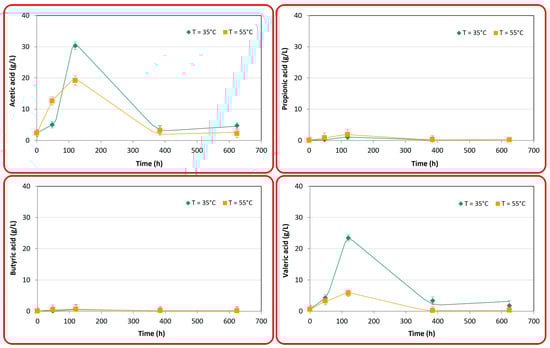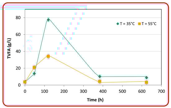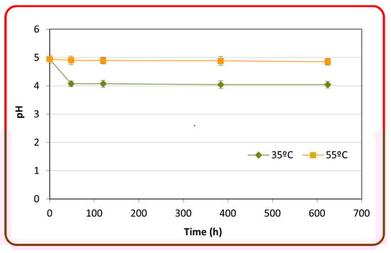 The pH level remained uncontrolled during the experiments. A decrease in pH (from 4.94 to 4.07 for mesophilic conditions and from 4.94 to 4.90 for thermophilic conditions) was observed in the first 48 h of the fermentation time, and it was constant from 48 to 624 h (Figure 2). Parawira et al. [] and Sarkar et al. [] obtained a pH profile similar to that obtained in our work when they carried out studies on the production of volatile fatty acids from potato waste using mesophilic fermentation and from brewery spent grains using thermophilic fermentation, respectively; they also verified an inhibition of methanogenesis when working at a pH around four to five. The higher decrease in pH for mesophilic conditions seems to be due to the greater production of VFAs [,].