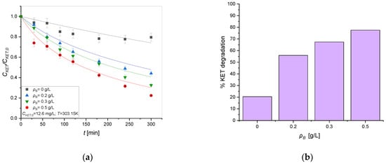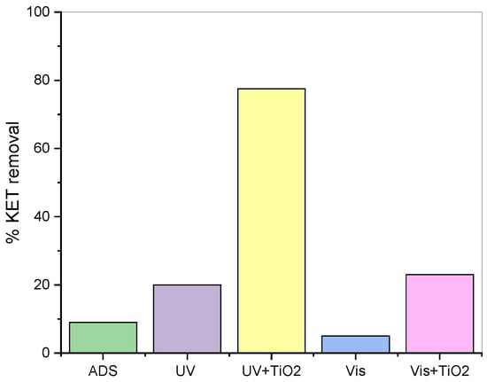 | TiO2 | t = 120 min Vsol = 10 mL CKET = 10 mg/L ρB = 0.50 g/L | UV-A = 22.75% UV-C = 61.12% | Petri dish | [26] |