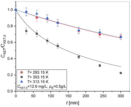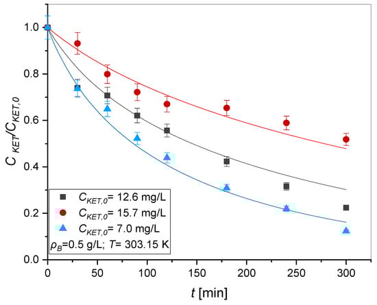 | Test | Q [mL/min] | VL [L] | ρB [g/L] | CKET,0 [mg/L] | pH | v [rpm] | T [K] | Light Source |
