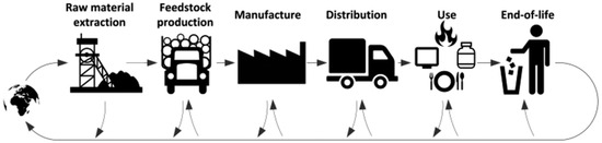 General life cycle phases of a product or process including recycling streams [65].