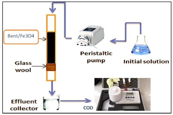 Glass columns of 32 cm in length and 1.7 cm in inner diameter were used for fixed-bed research (Figure 4). Glass beads were added to the top of the Fe3O4/Bent bed to guarantee that the effluent flow was dispersed uniformly when it entered the fixed bed. Glass wool and plastic mesh were added to the bottom of the column to stop the adsorbent from being lost throughout the process. A peristaltic pump was used to feed the influent at the top of the column and run it in a downflow mode. On the shape of the breakthrough curve and breakthrough capacity, the effects of beginning concentration (200–1000 mg/L), flow rate (3–3.8 mL/min), and bed height (2–4 cm) were investigated. At prearranged intervals, samples were taken at the bottom of the column. Before being analyzed, the collected effluent was preserved by acidification with 1 N HNO3, filtered through a 0.45 µm Whatman filter, and stored at 8 °C. A chemical oxygen demand device (COD) (type Lovibond ET 108/Germany) was used to measure the remaining concentration of gasoline emulsion.