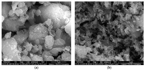 SEM micrographs: (a) raw bentonite, (b) Fe3O4/Bent.