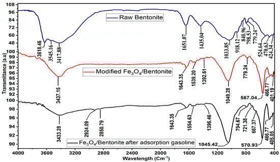 FTIR for raw bentonite, modified Fe3O4/Bent, and Fe3O4/Bent after adsorption gasoline.