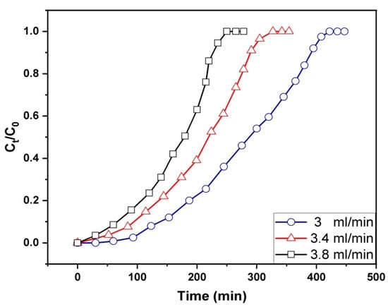 One of the most important factors in determining how long the solute remains in contact with the adsorbent surface is the flow rate. Figure 9 shows the gasoline breakthrough curves on Fe3O4/Bent at a range of flow rates from 3 to 3.8 mL/min, with a fixed starting concentration of 200 mg/L and a bed height of 3 cm. Increasing the flow rate from 3 mL/min to 3.8 mL/min accelerated the starting of breakthrough and exhaustion, according to the data. A decrease in the flow rate was found to cause a rightward shift of the breakthrough curves. However, the breakthrough curves grew steeper as the flow rates increased. Data such as the column’s adsorption capacity at exhaustion (qe) and MTZ length are presented in Table 3. The value of qe increased as the flow rate was reduced from 3.8 to 3 mL/min, as shown in Table 3, due to increasing the contact time between the adsorptive materials (adsorbate/adsorbent), leading to increasing the adsorption capacity. At the same time, when the flow rate was low, the MTZ values were low as well, which meant that the MTZ was becoming shorter. Because the MTZ travels more slowly over the fixed bed at a low flow rate, adsorption takes longer to occur, and the fixed bed takes longer to reach breakthrough and exhaustion [19]. Conversely, low qe values would be the consequence of a short duration of time for the gasoline emulsion to diffuse from the solute onto the binding sites on the surface and pores of the Fe3O4/Bent due to rapid flow rates.