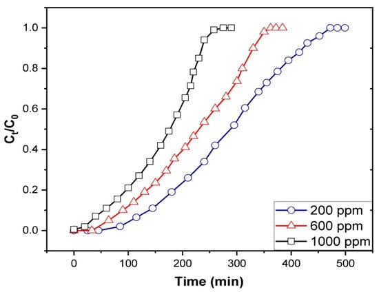 The gasoline emulsion breakthrough curves under various starting concentrations are shown in Figure 10. The curves show a constant flow rate of 3.4 mL/min and a bed height of 4 cm. The initial concentration was increased from 200 to 1000 mg/L, and a decrease in the time to breakthrough and exhaustion was noted. The breakthrough curves became more scattered, and the time to breakthrough was longer at low initial concentrations. The breakthrough curves steepened as the starting concentration was raised to 1000 mg/L, indicating the rapid saturation of the fixed bed. Table 3 shows that when the initial gasoline concentration was raised, qe values were seen to rise due to introducing more adsorbate molecules to the bed that can be adsorbed on the adsorbent’s surface, giving an increase in the adsorbed amount. As the starting concentration was lowered from 1000 mg/L to 200 mg/L, the value of the MTZ also decreased. The concentration gradient, or the difference in emulsion concentration on the Fe3O4/Bent surface and gasoline concentration in the solution, is the primary driving factor behind adsorption [70]. As a rule of thumb, increasing the concentration difference leads to higher adsorption rates. It also improves the gasoline uptake onto Fe3O4/Bent, as it provides a stronger driving force to overcome the mass transfer resistance. This explains that the higher the starting concentrations, the higher the qe values that can be obtained.