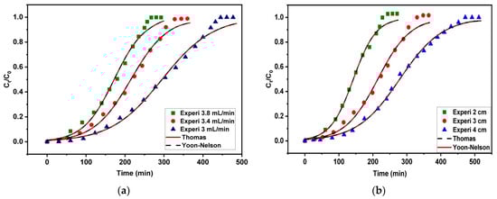 On the other hand, the Yoon–Nelson kinetic model is employed due to its simplicity, flexibility, and practicality, making it an appropriate choice for predicting the breakthrough curves in fixed-bed adsorption systems. Furthermore, it assumes that the decline in the adsorption rate for each adsorbate molecule is proportional to the probability of adsorption and breakthrough adsorption on the adsorbent. Moreover, it does not require any detailed data related to the characteristics of the adsorbent or the adsorbate’s characteristics, such as the adsorption isotherm or the mass transfer properties, and also about the physical properties of the adsorption bed [70]. In addition, the Yoon–Nelson model simplifies the prediction process of the breakthrough curves by requiring only two critical parameters: the time necessary for a 50% breakthrough (t50) and the rate constant (KYN). This simplification would allow for easy curve prediction when the adsorbent becomes saturated, and the containment adsorbate would begin to emerge in the effluent [71]. Equation (5) depicts the Yoon–Nelson model’s nonlinear form.