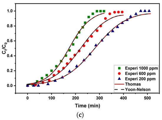 Kinetic models are used to represent the experimental data of gasoline emulsion adsorption under fixed-bed circumstances. The Yoon–Nelson and Thomas models are used to predict the breakthrough curves. The model parameters were estimated in the nonlinear identification procedure using the experimental data and the least-square method to fit the breakthrough curves [66,67]. The Thomas model is the most general and widely used theoretical model for evaluating column performance and forecasting the concentration–time profile of the complete breakthrough curve. It is assumed that adsorption is governed by mass transfer at the interface rather than chemical interactions between molecules. The model is based on experimental data obtained using the Langmuir adsorption isotherm model with no axial dispersion and the second-order reversible kinetic model [68,69]. Equation (4) provides the Thomas model’s nonlinear form.