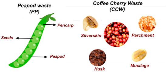 Despite the growing interest in valorizing agricultural waste, peapods remain an underexplored resource, with a limited number of studies dedicated to unlocking their full potential, most of them being focused only on the obtention of biochar [14,15,16]. In contrast, coffee waste has received more attention, but the focus has primarily been on spent coffee grounds (SCG), leaving the waste generated from the coffee cherry itself largely unevaluated [17,18]. The coffee cherry, which accounts for a significant portion of the coffee plant’s biomass, is often discarded during processing, presenting a substantial opportunity for valorization [19]. However, research has yet to fully explore the potential of this waste stream, having neglected the possibility of extracting valuable compounds and bioactive molecules or even using it as a feedstock for bioenergy production. This oversight highlights the need for a more comprehensive approach to coffee waste valorization, one that considers the entire value chain and seeks to maximize the utilization of all available biomass. By expanding our focus beyond SCG, we can uncover new opportunities for sustainable resource recovery and contribute to a more circular economy in the coffee industry. This leads to the goal of the present manuscript, which is to compare and valorize the biomass waste of peapods and coffee cherries in order to evaluate how the structural components of lignocellulosic biomass can influence its prospects regarding valorization.