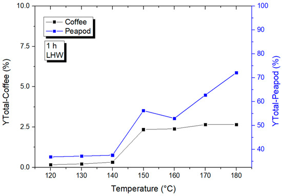 In order to observe the tendency of production of platform chemicals along the liquid hot-water temperature range, Figure 3 was obtained. It can be seen that there was a high total production yield for peapod waste (PPW), starting at a 36.902% total yield at the lowest temperature. On the other hand, coffee cherry waste (CCW) had very little total production (0.167%) at 120 °C. This shows that a lower energy is needed for the extraction and hydrolysis of PPW to take place, demonstrating how a higher initial lignin content can allow the acidic water to break through the lignocellulosic structure and achieve hydrolysis into sugars. The overall tendencies of both biomasses were very similar (although with a much higher yield for PPW): there was an initial extraction from 120 to 140 °C, where there was not much difference in the total yield; afterward, there was a marked increase at 150 °C, followed by an almost linear increase up until 180 °C. This shows that for both biomasses, processes over 150 °C have enough energy to favor hydrolysis into sugars and other subproducts. The initial structure and components of PPW waste allow for a higher valorization potential without the need for catalysts or extreme conditions, in contrast to CCW, whose structure is more peel-like and whose components are harder to valorize.
