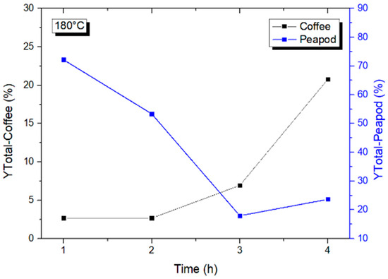 It is noteworthy that the yields obtained in the new experiments differed significantly from those obtained with the same catalyst in the 100 mL reactor. For example, using NaHCO3 (0.2 M) at 180 °C in the reactor of 100 mL, total yields of 10.108% and 53.286% were obtained using coffee and peapod biomasses, respectively. In contrast, using NaHCO3 (0.1 M) at 180 °C in the 500 mL reactor resulted in total yields of 24.261% (coffee biomass) and 36.210% (peapod biomass). These variations can be attributed to differences in catalyst concentration and mass and heat transfer in the reactors with different volumes. The smaller reactor had more homogeneous temperature control due to it is placement in an oven at the required temperature [37]. The bigger reactor was heated using resistors and sensors to regulate the temperature, with the biomass and water being heated to the desired temperature. The difference in the heating systems produced differences in the results that were obtained. Additionally, the 100 mL reactor was used at 30% of its capacity, whereas the 500 mL reactor was used at 20%. These differences could have changed the mass transfer in the systems.