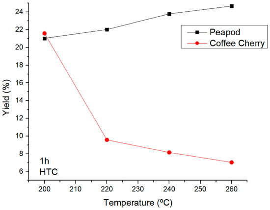 When increasing the temperature over 220 °C, the behavior of the biomasses differed once again: the peapod waste yield increased slightly after the initial drop at 200 °C, but in the case of the CCW, the highest amount of valorization was achieved at 200 °C, after which the yield dropped consistently as the temperature became higher.
