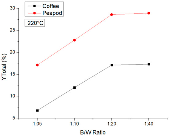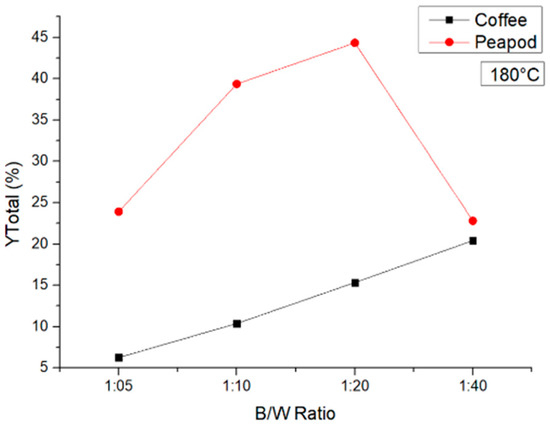 At 220 °C, it can be observed that the same trend was obtained with the peapod and coffee biomasses. As the biomass/water ratio decreased, the yields increased, and at the ratios of 1:20 and 1:40, no significant changes were observed. In Figure 7, it is notable that, using peapod biomass, the yields of platform chemicals were higher than when using coffee biomass and that at a higher temperature the differences between the yields using the 1:20 and 1:40 ratios were not meaningful. It was shown that at 220 °C and a ratio of 1:20, contact between the water and the biomass was favored. However, at a ratio of 1:40, the better contact was not enough to elevate the yield because the amount of biomass was not sufficient for the hydrothermal reaction to increase.