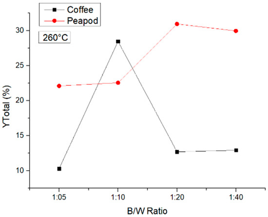 Finally, Figure 8 shows the results for the experiment at 260 °C. At this temperature, the obtention of biochar (solid) and formic acid (in the liquid) was favored. That is why the analysis of the total yield of the production of platform chemicals showed practically the production of formic acid alone. In the coffee waste experiments, a peak was observed when a 1:10 biomass/water ratio was used; even so, the yields for ratios of 1:05, 1:20, and 1:40 did not change importantly. In the peapod waste experiments, the same trend was observed as at 220 °C; the total yields increased as the biomass/water ratio decreased, but at a ratio of 1:40, the yield was lower than that achieved with a 1:20 ratio.