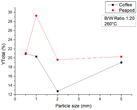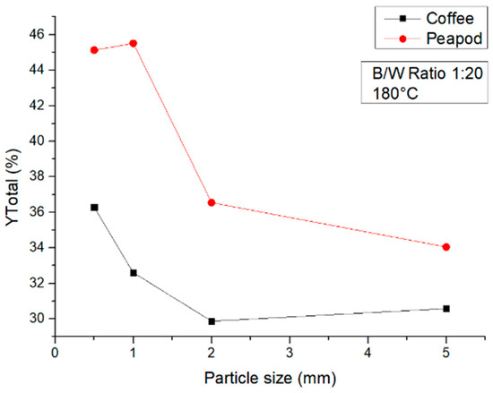 Figure 10, again, shows a similar tendency in both biomasses. There is an overall decrease compared to the total yield obtained at 180 °C, decreasing around 20% for CCW and PPW. This shows that if platform chemicals are desired, conditions of 180 °C are best for the overall yield in higher-volume reactors. At this temperature, there is a clear increase when using a particle size of 1 mm, which can be considered the optimum for this variable under these conditions. Smaller particle sizes can lead to too much energy being provided to the particles and hence a degradation of the platform chemicals and the biochar formed [30]. Bigger particle sizes can ensure that there is not too much contact between the water and the biomass and hence not too much breakdown of the lignocellulosic structures.