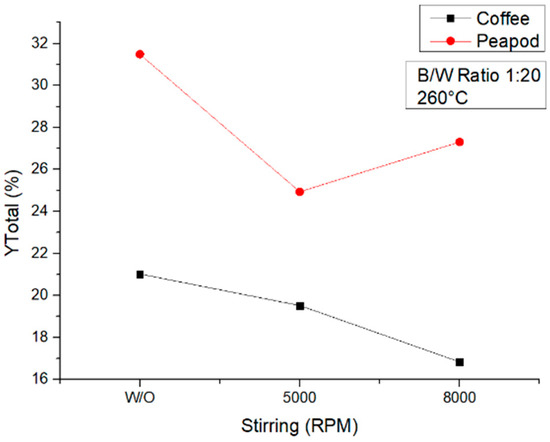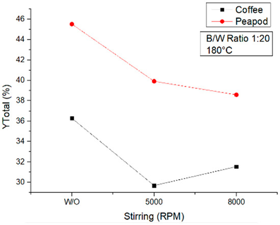 Figure 12 shows how for both the coffee and peapod waste samples, the use of stirring decreased the total yields of the reactions. Similar to the other assays performed, in general, the peapod waste produced higher amounts of all the platform chemicals, producing 10% higher yields than the coffee waste biomass. Stirring decreases the amount of platform chemicals produced. This can be because a sample of biomass that is not subject to stirring can receive a lot of energy in its external parts, and by irradiating it with energy, said parts of the sample transform more easily into other platform chemicals. On the other hand, under stirring, the particles become more homogeneous and hence the external parts do not receive all the energy, which is dissipated more through the sample. More particles receive lower amounts of energy, in contrast to conditions without stirring, where fewer particles receive higher amounts of energy.
