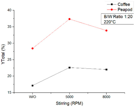 Stirring was the final variable to be assessed. The same temperatures (180 °C, 220 °C, and 260 °C) were used in a series of trials, with stirring at 5000 and 8000 revolutions per minute under autogenous pressure for one hour (measured after attaining the required temperature) in the 500 mL batch reactor. A 1 mm particle size was used for the peapod waste, and a 0.5 mm particle size was used for the coffee waste. A 1:20 biomass-to-water ratio (5 g biomass/95 g of water) was employed in the trials.