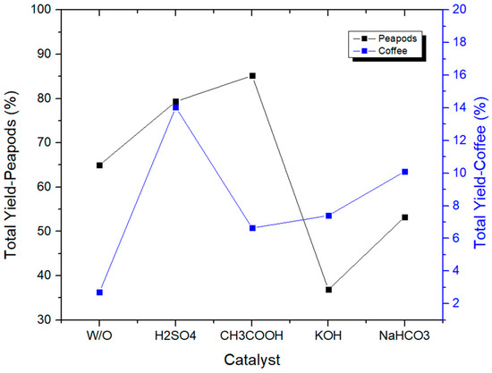 Figure 16 shows the total yields of reactions with catalysts performed for 2 h in a 100 mL reactor. The total yields of the reactions with catalysts for both coffee cherry waste and peapod waste exhibited distinct trends. For coffee cherry waste, the use of strong acids and basic catalysts resulted in a slight decrease in the total yield after two hours. This could be attributed to the fact that strong acids and bases can lead to over-processing of biomass, resulting in the degradation of valuable compounds and a decrease in the overall yield. In contrast, weak acid and base catalysts continued to increase the yield of the reaction, suggesting that these catalysts are more effective in facilitating the conversion of biomass components without causing excessive degradation.