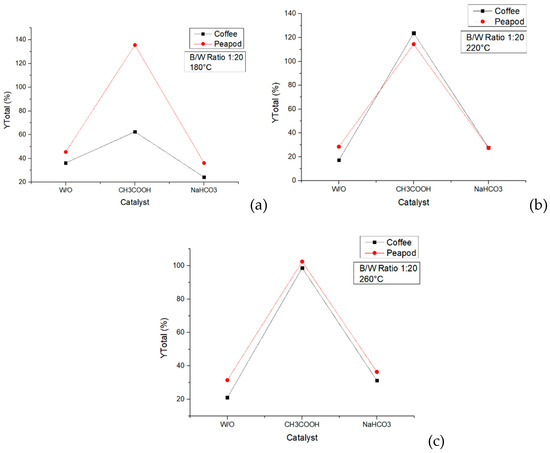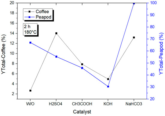 The same trend was observed in the coffee and peapod experiments at the three temperatures. The catalyst with CH3COOH obtained better yields than those obtained with sodium bicarbonate and without it. This occurred because using an acid catalyst favored the liquid products, whereas the basic ones favored the solid phase. At 180 °C, it is remarkable that using peapod biomass obtained higher yields than using coffee biomass. When the temperature went up, the difference in the total yields was not notable.