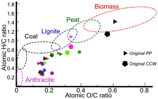 Most of the results obtained at 260 °C from peapod and coffee biomasses with modification of the variables are observed near the coal and anthracite zones. This indicates that parameters such as particle size, biomass/water ratio, and stirring do not significantly impact the characteristics of the solid products resulting from the hydrothermal reaction. The starting material in both cases differed a bit: CCW has a higher carbon content than PPW, which can thus be characterized as a typical biomass, whilst coffee is almost outside the range for biomasses.