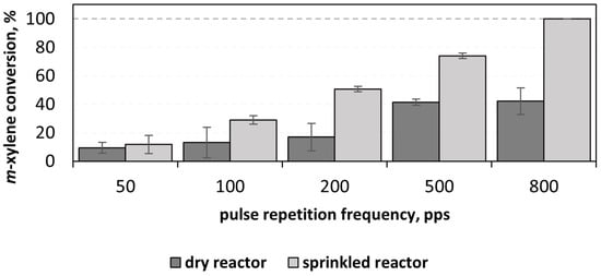 The pulse repetition frequency and, consequently, the input power affected the m-xylene oxidation rate in both the water-sprinkled and dry PCD reactor. Figure 2 presents the difference in m-xylene conversion depending on the pulse repetition frequency. It is evident that the sprinkling of water into the plasma environment induced the oxidative degradation of m-xylene. The difference is explained by different ROS formation in dry and humid air. Khadem et al. [] suggested different oxidation pathways, pointing to the formation of hydroxyl radicals OH• in humid air. The radical plays a crucial role as the most powerful oxidant, with a redox potential as high as 2.8 V [,,]. One can presume that water serves as the source of hydrogen-containing ROS (HO•, HO2•), which contribute to the radical-mediated oxidation.