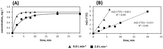 where kLa, CL, and are the mass transfer coefficient, and the aqueous m-xylene concentrations at time t and at the saturation point, respectively. Because of continuous gas inflow and the low solubility of m-xylene in water (146 mg L−1 at 25 °C), the VOC’s partial pressure remains constant during absorption, providing constant . As a result, the differential Equation (2) can be solved with boundary conditions: t = 0 to t and corresponding CL = 0 to . This allows the linearized form of the dependence of the aqueous concentration on time (Equation (3)) occurring during absorbance (Figure 3B) to be obtained:
