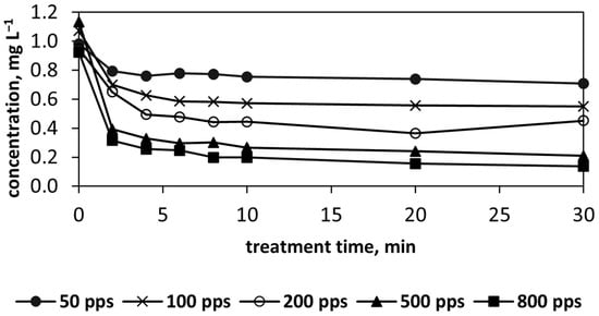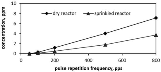 In a plasma environment, air oxygen is prone to ionization, forming ozone. One can see that the discharge power input almost linearly affects the ozone yield, i.e., higher pulse frequency results in higher concentrations of ozone in the air outflow. The linear growth in ozone production is explained by the difference between the ozone concentration and its maximum achievable concentration at the equilibrium state in the sprinkled PCD reactor with no air flow, reaching about 3000 ppm (5 mg L−1) []. Increased pulsed power input naturally improves ozone production at the air flow rate applied in the experiments.