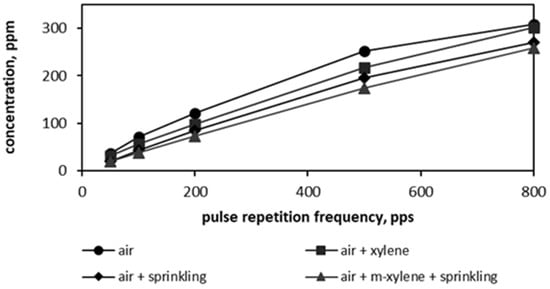 The dependence of ozone gaseous concentration on the pulse repetition frequency in the plasma reactor is given in Figure 5. Ozone concentration in the air outflow was measured in the absence and presence of m-xylene vapors with and without water sprinkling 7 to 10 min after the start of the experiment. Ozone concentration remained stable within 15 to 20 min of measurements.