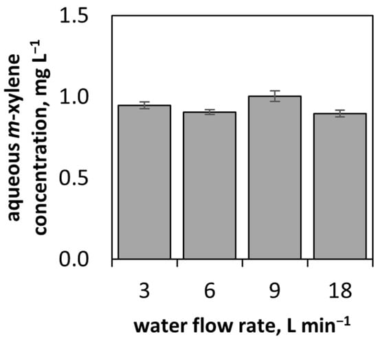 m-Xylene concentration in water dependent on water flow rate with airborne xylene input concentration 20 ± 5 ppm, air flow rate 6 m3 h−1, pulse repetition frequency 100 pps, pH 6.0–6.5.