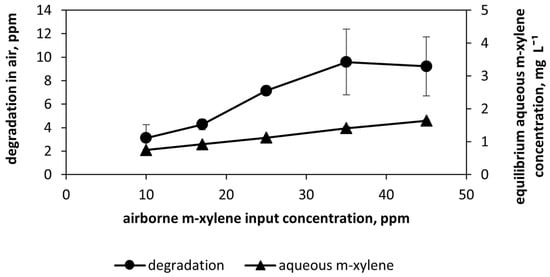 The effect of m-xylene input concentration on its removal rate was studied within the interval of 10 to 45 ppm at 100 pps. At m-xylene input concentrations of 35 and 45 ppm, the net degradation, i.e., the difference between influent and effluent concentrations of m-xylene, approached its maximum of about 10 ppm, showing no more growth in the VOC removal. This points to the limit in the amount of ROS available at this input power of 12.5 W. This observation is supported by the higher aqueous concentration of m-xylene at its higher content in air, i.e., the gaseous VOC concentration continued to grow (Figure 7).