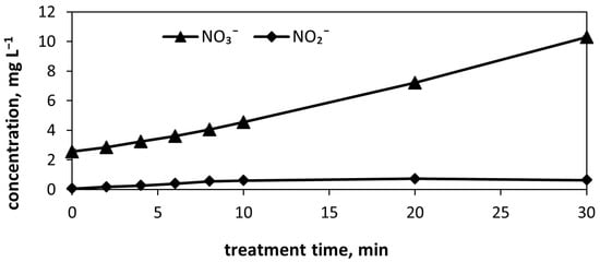 Nitrous oxide experiences either a hydroxyl-radical attack at the gas–liquid interface, producing nitrites identified in the aqueous phase (Figure 9) and reducing the N2O concentration in treated air (Figure 8); or the formation of nitrous oxide may be reduced in water-sprinkled PCD due to straightforward oxidation of nitrogen to NO and further to NO2 and, ultimately, to nitrate, thus providing lower concentrations of N2O. Nitrites are formed as intermediates determined in the aqueous phase in low concentrations, whereas nitrates tend to grow continuously (Figure 9).