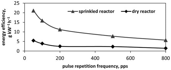 where E—energy efficiency, g kW−1 h−1, ΔC—the difference between m-xylene concentrations in inlet and outlet air streams, g m−3, Q—air volumetric flow rate, m3 h−1, P—pulsed power input, kW. One can see a significant difference in energy efficiency, with oxidation in the sprinkled reactor surpassing that in dry conditions by four to six times at 50 and 800 pps, respectively. This indicates the crucial role of water in accelerating m-xylene oxidation, and shows the advantageous character of pulsed discharge techniques in providing safe oxidation of airborne pollutants in air–water mixtures that is impossible for DC and AC coronas.