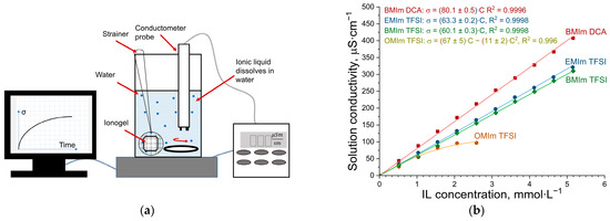 (a) The scheme of the experimental setup to assess the washout of ionic liquids from ionogels; (b) the conductivity of the ionic liquids used in the experiments vs. their concentration.