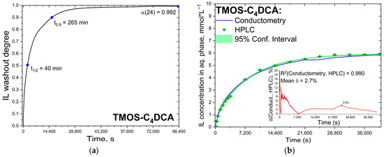 (a) The conductometry washout experiment for the TMOS-C4DCA sample and (b) the comparison of washout levels assessed using conductometry and the HPLC measurements.