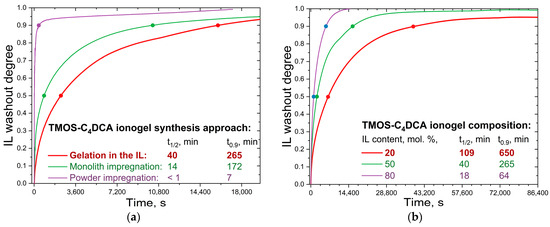 Kinetic washout curves for the TMOS-C4DCA-based ionogels with different (a) preparation methods (the gelation of silica directly in the IL or the impregnation of highly porous silica in powdered or monolithic form), and (b) IL content.