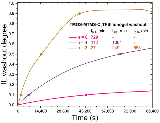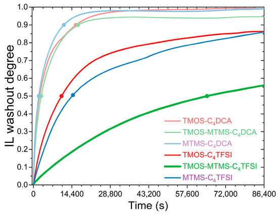Washout kinetic curves for the ionogels with different hydrophobicity of the silica matrices and the ionic liquids.