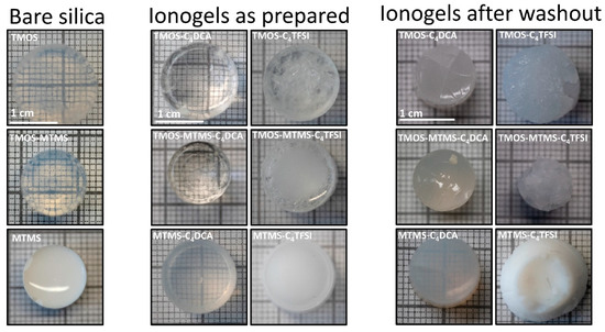 After the washout experiments, the samples retained their monolithic shape and became translucent to opaque (Figure 5). For some samples, minor cracking was observed (e.g., TMOS-C4DCA). The TMOS-MTMS-C4TFSI sample showed peculiar onion-like behaviour during the washout, the outer fragments of the monolith flaking off, exposing the inner core.